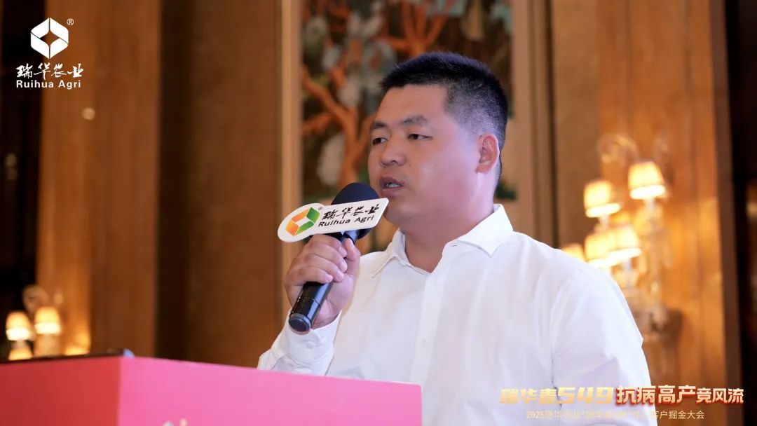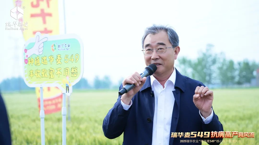 觀摩結(jié)束后,大會進(jìn)入室內(nèi)議程。夏中華總經(jīng)理在致辭中對嘉賓的長期支持致以誠摯感謝,并強(qiáng)調(diào)瑞華農(nóng)業(yè)將持續(xù)推出優(yōu)質(zhì)品種,與各位伙伴深化合作。研發(fā)部經(jīng)理楊永樂詳細(xì)介紹了瑞華麥549的培育歷程與技術(shù)優(yōu)勢:該品種兼具抗病、抗倒伏、適應(yīng)性廣等特性,豐產(chǎn)潛力高,市場前景廣闊。